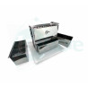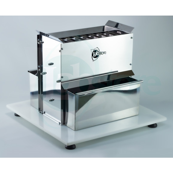 Tipo Johnes. Utilizado para dividir ou quartear amostras de sementes de grãos e de forrageiras, o material derramado no seu interior passa por 18 canaletas de 20 mm de largura e é dividido em 2 porções, que são colhidas em 2 bandejas. Construído em aço inox 304 com base de nylon, provida de pés reguladores de nível.