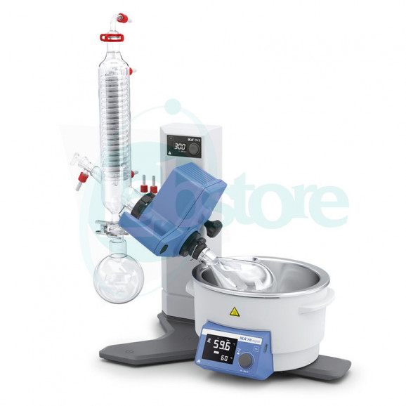 The RV 8 Rotary Evaporator is the manual basic model in the family of IKA Rotation Evaporators. It finds a multitude of uses in the chemical, pharmaceutical, and biotechnology industries, in research and development, in manufacturing and quality assurance, in laboratories, and in plant construction. Thanks to specially designed glass guides, the vertical condenser makes extremely efficient use of the 1500 cm² cooling surface. Digital displays for speed and heating bath temperature enable optimum control of all distillation processes.